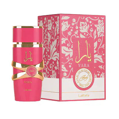 Newest Yara flanker: juicy blackcurrant + green tangerine over strawberry fizz candy and gardenia, drying down to vanilla syrup, amber, musk and sandalwood. A playful, candied fruity-vanilla cloud.